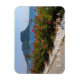 Une belle vue sur le Rocher de Garda et les fleurs colorées du lac de Garde en Italie imprimé sur un aimant souvenir frigo.