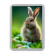 Cet aimant montre un lapin brun et blanc chéri qui profite du soleil du printemps alors qu'elle s'assoit sur l'herbe avec des oeufs de bonbons colorés près de ses pieds.