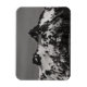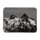 Une photo en noir et blanc de deux pics dans la Tatoosh Range connue sous le nom de Le Château et le Pinacle. La chaîne montagneuse est recouverte de neige malgré l'été. Il y a des arbres et des pierres éparpillés dans le paysage et les montagnes. La position du soleil permet de jeter des ombres sur la montagne. Les nuages d'incognito gracient le ciel. Copyright ©2023 Kimberly J Tilley. zazzle.com/store/developingnature