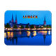 Une belle photographie du port de Lübeck éclairé. Remarque : l'aimant tient parfaitement au réfrigérateur. Le bleu foncé de l'eau et le bleu ciel encadrent la ville hanséatique. Si vous appréciez les marines, vous aimerez...