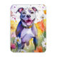 Une image art numérique d'un pit bull dog avec sa langue se dresse au milieu de fleurs vibrantes et d'un arrière - plan abstrait coloré. Des éclats de couleurs vives et des détails fantaisistes créent une scène animée.
