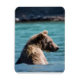 The bear's expression is one of quiet focus and stoicism. With its ears perked and its gaze fixed on something downstream, it exemplifies the raw, untamed spirit of the Pacific Northwest. The vibrant, teal-blue water creates a stunning contrast against the earthy tones of the bear’s fur, while the soft-focus background of rocky shoreline emphasizes the solitude and scale of the Alaskan wilderness.
