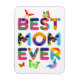 Meilleure maman Jamais texte-image décorative contre l'arrière - plan blanc. Cinq papillons colorés flottent autour de l'image ou s'assoient sur une lettre. Un aimant photo flexible personnalisable pour célébrer la fête des mères, l'anniversaire ou toute autre occasion. Vous pouvez changer de papillons et placer quelques photos à la place d'eux. Utilisez le bouton "Personnaliser" pour modifier la taille de l'image texte, déplacer les papillons ou changer la couleur de l'arrière - plan. Amusez-vous, customisez et achetez-en un, et soyez heureux !