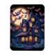 L'image représente une maison hantée stylisée la nuit. La maison est grande avec des toits pointus et plusieurs fenêtres émettant une lueur jaune, suggérant la lumière intérieure. Autour de la maison sont de nombreuses chauves-souris en vol contre un ciel sombre. Au premier plan, il y a un cimetière avec des pierres tombales, ce qui ajoute à l’atmosphère étrange de la scène. Cette image est intéressante en raison de ses éléments thématiques communément associés à l'horreur ou Halloween et sa palette de couleurs vibrantes mais foncées qui donne une humeur éffrayante.