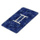A silver chrome like Gemini zodiac symbol applique on a navy blue digital camouflage design texture print background. A modern urban racy design for a great custom birthday gift idea.