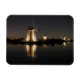 Photo souvenir rectangulaire aimant d'un paysage avec de multiples moulins à vent, illuminé la nuit, avec réflexion dans l'eau calme du canal à Kinderdijk, la Pays-Bas.