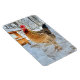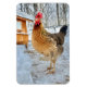 Cet aimant présente un beau poulet brun à cornes blanches qui pose devant chez elle après une tempête de neige.