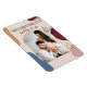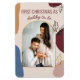 Aimant photo pour le premier Noël de quelqu'un de spécial. L'exemple de libellé dit "Premier Noël comme papa à être" et vous pouvez modifier ceci comme vous le souhaitez. Le design comprend des feuilles saints dessinés en noir et or, des formes organiques et une arche en or avec une police voûtée pour encadrer votre photo. Ce design branché présente une palette de couleurs terreuses de rose pâle, bleu, brique et jaune ocre.