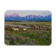Cette photo montre un troupeau de chevaux qui courent devant la chaîne de montagnes du Grand Teton dans le Wyoming rural au petit matin.