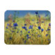 Chicorée bleue vif et fleurs de maïs fleurissent dans un champ doré d'herbe sous un ciel bleu pâle. L'arrière - plan blond et vert est également interrompu par le rose étincelant des fleurs d'herbe moelleuse.