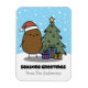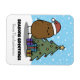 A cute Christmas magnet featuring a cartoon potato in a whimsical Christmas scene. The potato is in front of a Christmas tree that has lights attached and a star on top. The background is a winter scene with snow. On the front are templates to add your name and message to personalize.