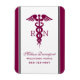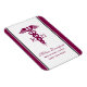 Personalized flex magnet with a stylish red cadaceus symbol with the letters R N on either side. A reddish purple border with a black stripe on either side.