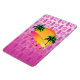 Graphique de surf avec planches de surf, palmiers, fleurs d'hibiscus roses et coucher de soleil. Avec un arrière - plan rose de tortues de mer hawaïennes Honu et des masques Tiki.