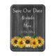 Annoncez votre prochain jour de mariage pour la famille et les invités avec un tournesol Patiné rustique Enregistrer l'aimant de la date. L'ameublement Magnet est doté d'un arrière - plan en bois rustique et d'un élégant bouquet de tournesols. Personnalisez avec les noms du marié et de la mariée avec la date du mariage. Papeterie mariage supplémentaire et cadeaux disponibles avec ce design aussi.