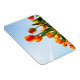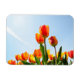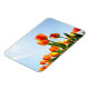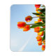 Aimant photo rectangulaire avec des fleurs composées de tulipes orange et rouge vu d'un point de vue bas contre un ciel bleu.
