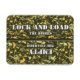 Un aimant pour lave-vaisselle pour les amateurs de canons. Un arrière - plan de camouflage vert a le texte, "Verrouiller et charger les plats" et "Vider la chambre" dans une police militaire blanche. Une ligne horizontale de coordination sépare les côtés propres et sales de l'aimant.