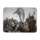 Dessin au crayon ou illustration représentant des Vikings embarquant à bord d'un bateau à mâts. Oeuvre de Knud Bergslien.