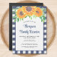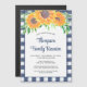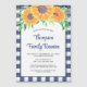 Invitation votre famille à leur réunion avec cette invitation magnétique florale rustique. Il est décoré de tournesols aquarelle et de feuillage dans les tons jaune et vert sur un arrière - plan en vichy bleu. Facilement personnalisable avec vos détails de réunion. Aquarelle originale © Michele Davies.
