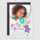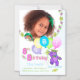 Invitation photo de tenue magnétique de la fête de 8e anniversaire avec nom personnalisé avec une princesse d'ours mauve souriante et souriante vêtue d'une belle couronne jaune ornée de jupons et d'accessoires de fleurs rose, bleu, jaune et vert tenant un tas de ballons avec le mot PARTY sur eux. Personnaliser avec la photo et le nom de l'enfant le rend spécial. Enregistrer l'aimant de date est un rappel amusant sur le réfrigérateur. Design original par Anura Design Studio.