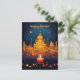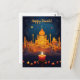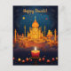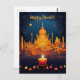 Superbe carte postale Diwali avec vue nocturne d'un temple et texte personnalisé au milieu dans les tons jaune et orange sur arrière - plan foncé