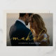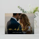 Une photo moderne et élégante merci carte à plat conçue pour accommoder votre photo mariage horizontale ou paysagère préférée avec le Hawaiien merci de saluer "Mahalo" comme un script de feuille d'or superposition texte. Personnalisez avec vos noms et/ou la date du mariage en dessous, et ajoutez un message pré-imprimé au verso. Pour laisser vide votre message manuscrit, supprimez simplement l'exemple de libellé.
