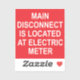 A red sticker with the words "MAIN DISCONNECT LOCATED AT ELECTRIC METER" in white letters. Good for electricians to satisfy labeling requirements.