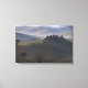 Impression paysagère en toile d’une ferme dans le brouillard matinal à l’aube en Toscane entre les collines vallonnées de la vallée du Val d’Orcia entre Pienza et San Quirico d’Orcia en Italie.