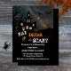 Dîner d'Halloween invitation mettant en vedette une maison hantée sur une colline la nuit, avec araignée et chauves-souris ...