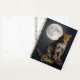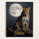 A powerful leopard with piercing yellow eyes and a sleek, spotted coat sits majestically on a stark, solitary branch. One paw dangles artfully across the center of the illustration, hinting at movement. Behind him, a vast, luminous harvest moon hangs in the inky night sky, casting an ethereal glow. Awesome personalized planner for anyone who loves leopards.