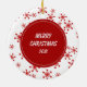 Sur le devant de cette décoration de vacances se trouve un beau portrait d'un chien malamué portant un chapeau de Père Noël rayé rouge et blanc. L'image est placée sur un cercle blanc encadré par un motif de flocon rouge rétro. Le dos de l'ornement a le même arrière - plan et cercle avec votre texte personnalisé en blanc sur un arrière - plan rouge correspondant.