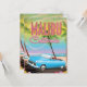Malibu California affiche de voyage d'époque d'une vieille voiture classique au bord d'une belle plage.