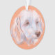 Ce petit Maltipoo blanc au visage sucré est capturé dans des pastels doux sur un papier chaud couleur terre cuite orange.