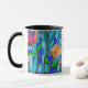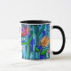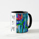 Beaux bleus dans cette oeuvre d'art artistique, de style mosaïque. Des fleurs ornent cette mug Maman qui combine la nature et l'art. Maman en lettrage au centre de la tasse. Un cadeau de la grande fête des mères, un cadeau d'anniversaire ou juste pour la raison.