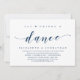 Thème élégant bleu marine de style moderne, carte d'invitation de mariage en fuite (Manger, Boire et Danser). C'est parfait pour votre célébration décontractée de mariage en bord de lac.