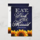 Eat Drink and Be Married Rustic Wedding RSVP Cartes-correspondent aux invitations et plus trouvées ci-dessous sur cette page. Complimentez votre thème mariage de tournesol avec ces cartes rsvp qui comportent un tableau bleu comme un arrière - plan avec "Mange, Bois & Etre Marié" dans un script amusant et élégant avec des tournesols vibrants au bas de l'avant et de l'arrière de chaque carte.Ces cartes RSVP de mariage sont définies à un stock de carte de base de haute qualité; cependant, vous pouvez changer le stock en lin, feutre (gaufré), recyé, recyclé, recyclé, recyclé, plusieurs teintes métalliques si vous souhaitez sous le numéro 2 (choisissez votre style, taille & type de papier) sous le bouton orange ajouter au panier. Une liste des coûts supplémentaires pour un stock de carte de crédit s'affiche également sous cette option. Chaque carte RSVP est munie d'une enveloppe blanche intégrée. Conseils pour Customiser vos cartes RSVP de mariage Ce style permet une réception sous forme de buffet. Si vous avez besoin d'un RSVP 2 ou 3 plats, faites défiler vers le bas pour trouver les produits disponibles. Cliquez sur le bouton personnaliser orange sous la démo de la carte RSVP du mariage ci-dessus pour changer la police, la couleur du texte ou la taille à ce que vous préférez. Si vous êtes satisfait du style de police, de la couleur du texte et des tailles, vous pouvez utiliser la fonction personnalisée à droite de la démo pour simplement modifier les informations de démonstration à vos détails personnels de mariage. Assurez-vous de regarder la démo après avoir modifié les détails (la démo change automatiquement après avoir modifié le texte, la taille ou les couleurs de police). La démo vous donnera alors une preuve de votre invitation après avoir effectué les changements. Cliquez sur le bouton loupe au-dessus de la démo RSVP pour obtenir une preuve complète. Vous pouvez également cliquer sur chaque image (avant et arrière) pour vérifier chaque côté après avoir effectué les modifications. Un autre conseil est de cliquer sur le bouton design au-dessus de la démo pour zoomer pour voir plus de détails et obtenir un meilleur aperçu des couleurs et de la décoration du design. Assurez-vous de vérifier chaque côté de la carte avant d'ajouter à votre panier pour le retirer en suivant les conseils ci-dessus.