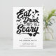 Cette invitation élégante présente un design de typographie noir et blanc avec les mots "Mangez boire et soyez effrayant. C'est la façon parfaite d'ajouter une touche de plaisir et de sophistication à votre fête d'Halloween et de faire savoir à vos invités qu'ils sont dans pour un bon moment effrayant. Ce sera certainement un succès pour tous ceux qui le reçoivent.