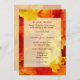 Invitations à plat mariage d'automne. Des feuilles orange et jaune vif bordent un arrière - plan de feuilles d'automne avec du texte rouge foncé en police calligraphique. Cette invitation 5x7 a les parents invitant les invités au "mariage de leur fille".