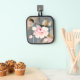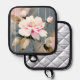 A watercolor of a light blush flower on a blue-gray and pink background with white streaks like rain creates a beautiful and romantic pot holder.
