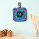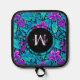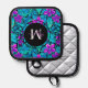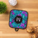 Joli motif élégant de fleurs violettes, bleues, turquoises, turquoise et vertes et feuillage personnalisé potholder initial et nom de famille. Fait un grand mariage ou un cadeau pour le ménage.