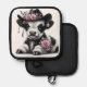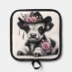 Illustration d'une jeune vache noire et blanche, décorée avec des accents casquettes et fleuris, évoquant des thèmes de la nature, de l'innocence et de la beauté par sa charmante composition et sa présentation artistique.