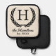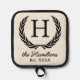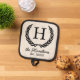 Découvrez un porte-pot distinctif orné d'une typographie noire sophistiquée et d'un script de calligraphie sur un tissu blanc crème, personnalisable avec les noms de votre couple et le nom de famille dans un style typographique noir sur un arrière - plan en ivoire crème. Ajoutez la date de fondation de votre famille pour créer un article aussi unique que votre histoire collective. Ce design attrayant, décoratif et élégant convient à la fois au boulanger de maison et au chef professionnel.