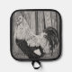 Roo était un coq de faverolle saumon et l'un des animaux les plus doux que j'ai eu. Il aimait être choyé et tenu, serrant tranquillement tout le temps. Il posait aussi souvent, ce qui en faisait un bon modèle. Le design pour ces porte-casseroles est un dessin de stylo que j'ai fait avec des stylos noirs et blancs sur du papier gris.
