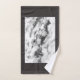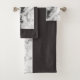 La serviette de bain a une bande de gris foncé de fumée en bas du côté droit et un beau motif de marbre noir, gris et blanc de l'aile gauche. La serviette de main a le motif de marbre au milieu et un cadre de fumée foncée gris et du tissu de lavage est tout le marbre. Un bel ensemble.