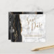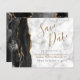 Ce mariage élégant à budget sauver la carte date dispose d'une bordure d'aquarelle noire taillée avec fausse parties scintillant or. Le texte personnalisable combine écriture manuscrite noir et or, polices cuivre et italique sur un arrière - plan en marbre gris et blanc. L'envers est assorti d'un design d'agate noir et or.