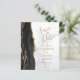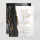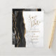 Le bord gauche de cet élégant mariage moderne, sauf la carte de date, est doté d'une bordure en aquarelle noire taillée avec une parties scintillant en faux or. Le texte personnalisable associe écriture manuscrite dorée, cuivre et polices italiques sur un arrière - plan en marbre gris et blanc. L'envers est assorti d'un design d'agate noir et or.