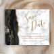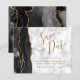 Cette élégante carte "save the date" pour un mariage à petit budget présente une bordure d'agate à l'aquarelle noire rehaussée de paillettes dorées fausses. Le texte personnalisable combine une écriture manuscrite noire et dorée, des polices copperplate et italique sur un fond de marbre gris et blanc. Le verso présente un motif assorti d'agate noire et dorée. REMARQUE : les enveloppes ne sont pas automatiquement incluses avec ces invitations à petit budget, alors n'oubliez pas de choisir l'option "enveloppes blanches vierges" !