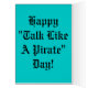 Parlez comme une carte de voeux de pirate comportant l'art de public domain de l'illustrateur et de l'auteur pirate-orientés remarquables, Howard Pyle. La carte lit avec le capitaine disant, "Avast ! Si le YE refusent de parler comme un pirate, alors le YE marchera comme un pirate, voyou du YE," et le membre d'équipage répond, "la poussent vers le haut de votre butin, Captain l'Un-crabe. Comment est ce pour commencer ?"