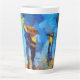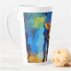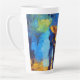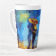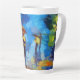 Cette tasse en latte personnalisée présente une peinture à la main d'un couple portant un parapluie tandis que les gouttes de pluie tombent. L'arrière - plan se compose d'un paysage artistique coloré.
