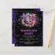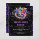 Invitation sur papier de la partie Mardi Gras sur mesure. Doté d'un masque de mascarade Mardi Gras coloré et d'une fausse impression de parties scintillant sur un arrière - plan noir.