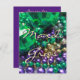 La photo d'une perle colorée du Carnaval jette. Les couleurs de Mardi Gras (or, vert, violet) sont ornées d'un grand lancer de perle verte encadrant la photo. Le recto de la carte d'invitation indique "Mardi Gras". Le dos des cartes invitations a "Laissez les bons temps rouler !" comme un espace de salutation pour vous ajouter des détails personnalisés d'invitation de fête carnavalesque. Tous les mots sur la carte peuvent être personnalisés, selon les besoins.